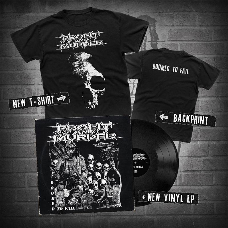 Das Profit And Murder Bundle entält die LP, Doomed To Fail, und ein doppelseitig bedrucktes T-Shirt von Fruit Of The Loom aus 100% Baumwolle, mit Front - und Rückendruck, Siebdrucktransfer.